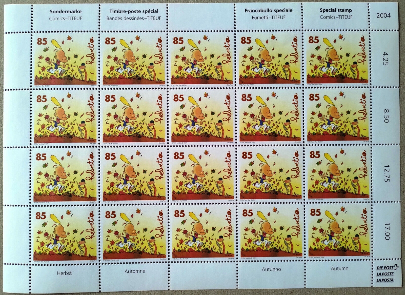 ZEP – TITEUF PLAQUE DE TIMBRES (20X) AUTOMNE non oblitéré – 2004